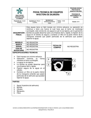 Este documento proporciona información sobre una inyectora de salmuera utilizada para inyectar salmuera en la carne. Describe las partes del equipo, cómo funciona, instrucciones de uso, características de uso, mantenimiento y procedimientos de limpieza. El equipo consta de una aguja, bomba, cilindro y manguera que permiten inyectar de forma continua la salmuera para conservar la carne. Se debe realizar limpieza y desinfección regular para mantener el equipo en buen estado y evitar contaminación