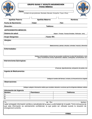 Este documento es una ficha médica que recopila información sobre la salud de un miembro de un grupo de guías y scouts. Contiene detalles como el nombre, fecha de nacimiento, grupo sanguíneo, alergias, enfermedades crónicas, cirugías previas, medicamentos que toma y datos de contacto para emergencias. El objetivo es proporcionar información médica relevante para el cuidado del miembro en actividades y en caso de una emergencia.
