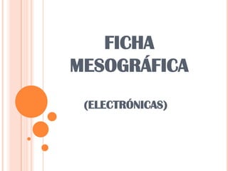 Este documento describe cómo crear fichas mesográficas para registrar información extraída de fuentes electrónicas como páginas web e incluye instrucciones para anotar datos como el autor, título, dirección URL y fecha de consulta para artículos de revistas en línea y software. También especifica cómo registrar información adicional como resúmenes o versiones cuando se trata de material bajo suscripción o software.