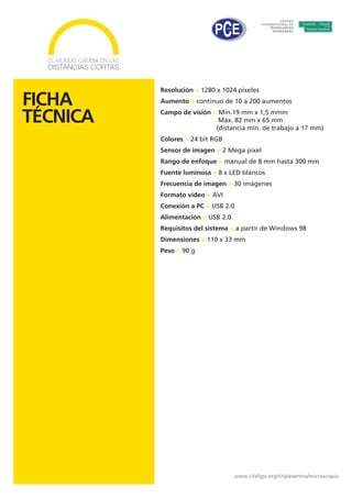 El documento describe un microscopio USB, el cual permite ver objetos con aumentos de hasta 200 veces a través de una computadora. Viene con soporte, cable USB, software y trípode. Proporciona imágenes de alta resolución y video. Se usa para analizar detalles de plantas, objetos y organismos pequeños para trabajos y enseñanza.