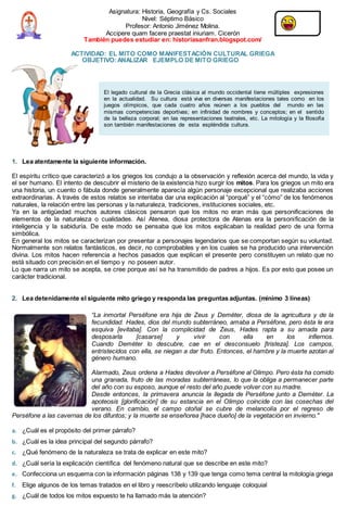 Este documento presenta un mito griego sobre Perséfone y Deméter para analizar el mito como una manifestación cultural griega. El primer párrafo explica que los mitos griegos surgieron para dar explicaciones a fenómenos naturales a través de historias con personajes extraordinarios. El mito narrado trata de explicar los ciclos estacionales a través de la historia de Perséfone, quien es raptada por Hades pero debe pasar parte del año con él debido a que comió una granada del inframundo. Esto representa las estaciones
