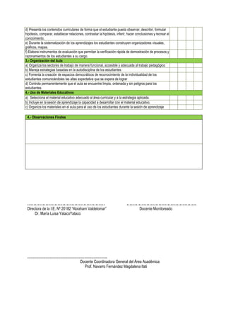 Este documento presenta una ficha de monitoreo para evaluar el desempeño de un docente en el aula. La ficha incluye secciones para datos generales, indicadores de planificación, organización de procesos pedagógicos, organización del aula y uso de materiales educativos. El docente será evaluado en estas áreas clave para determinar cómo cumple con los estándares de enseñanza.