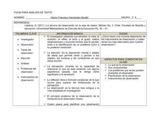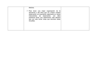 El documento describe la técnica de observación en la sala de clases. Explica que la observación es la técnica más antigua y comúnmente usada en investigación educativa. Detalla los cuatro pasos para planificar una observación efectiva y la importancia de utilizar múltiples instrumentos de observación para tener una visión completa. También discute los desafíos que enfrentan los observadores como mantener la atención y analizar sin sesgos.