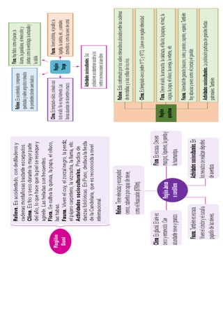 El documento describe las diferentes regiones naturales del Perú, dividiéndolas en la región costa, yunga, quechua, suni, puna, janca, rupa-rupa y omagua. Cada región se caracteriza por su relieve, clima, flora y fauna particulares.