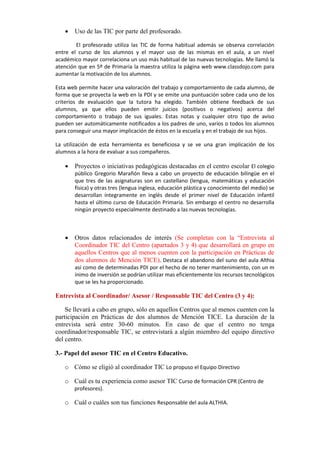 El documento describe una propuesta de intervención durante el Practicum I para estudiantes de la Mención TICE en la Facultad de Educación de Toledo. El objetivo principal es que los estudiantes conozcan y reflexionen sobre el uso de las TIC en la organización escolar, la enseñanza, y el aprendizaje de los estudiantes. Incluye un esquema para la recogida y presentación de información sobre un caso de estudio en un aula de Practicum I, incluyendo datos del contexto escolar, entrevistas con el coordinador TIC, y observaciones