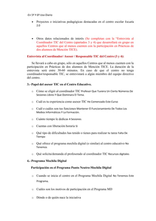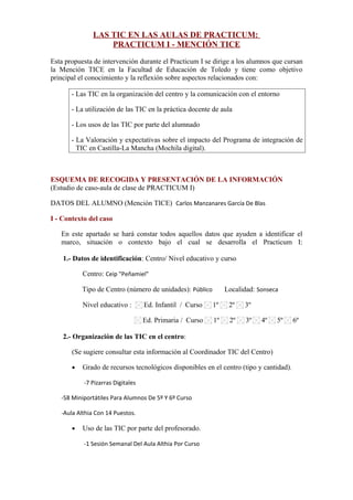 El documento presenta una propuesta de intervención durante el Practicum I para estudiantes de la Mención TICE en la Facultad de Educación de Toledo. El objetivo principal es conocer y reflexionar sobre el uso de las TIC en la organización escolar, la práctica docente, el uso por los estudiantes, y la valoración del programa Mochila Digital. Se incluye un esquema para la recopilación de información que incluye datos del estudiante, el contexto y dos relatos de observación de clase.