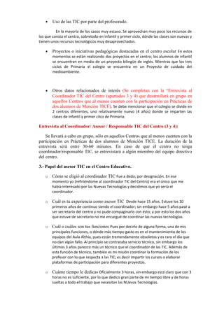 El documento describe un proyecto de prácticas para estudiantes de la mención TICE en la Facultad de Educación de Toledo. El objetivo es que los estudiantes conozcan y reflexionen sobre el uso de las TIC en la organización y comunicación de un centro educativo, su uso en la enseñanza y por los estudiantes. También se analiza la valoración e impacto del programa Mochila Digital en Castilla-La Mancha. El documento proporciona un esquema para recoger información sobre el contexto y uso de las TIC a través
