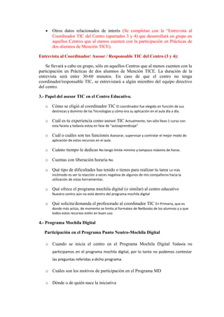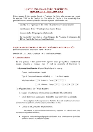 Este documento describe un proyecto de observación de prácticas docentes para estudiantes de la mención TICE en la Facultad de Educación de Toledo. El objetivo es que los estudiantes observen y reflexionen sobre el uso de las TIC en el aula, la organización de las TIC en el centro educativo, y las actitudes de los estudiantes y profesores hacia las TIC. El documento proporciona un esquema para que los estudiantes recojan datos sobre las sesiones observadas, incluyendo detalles sobre el contexto, el uso