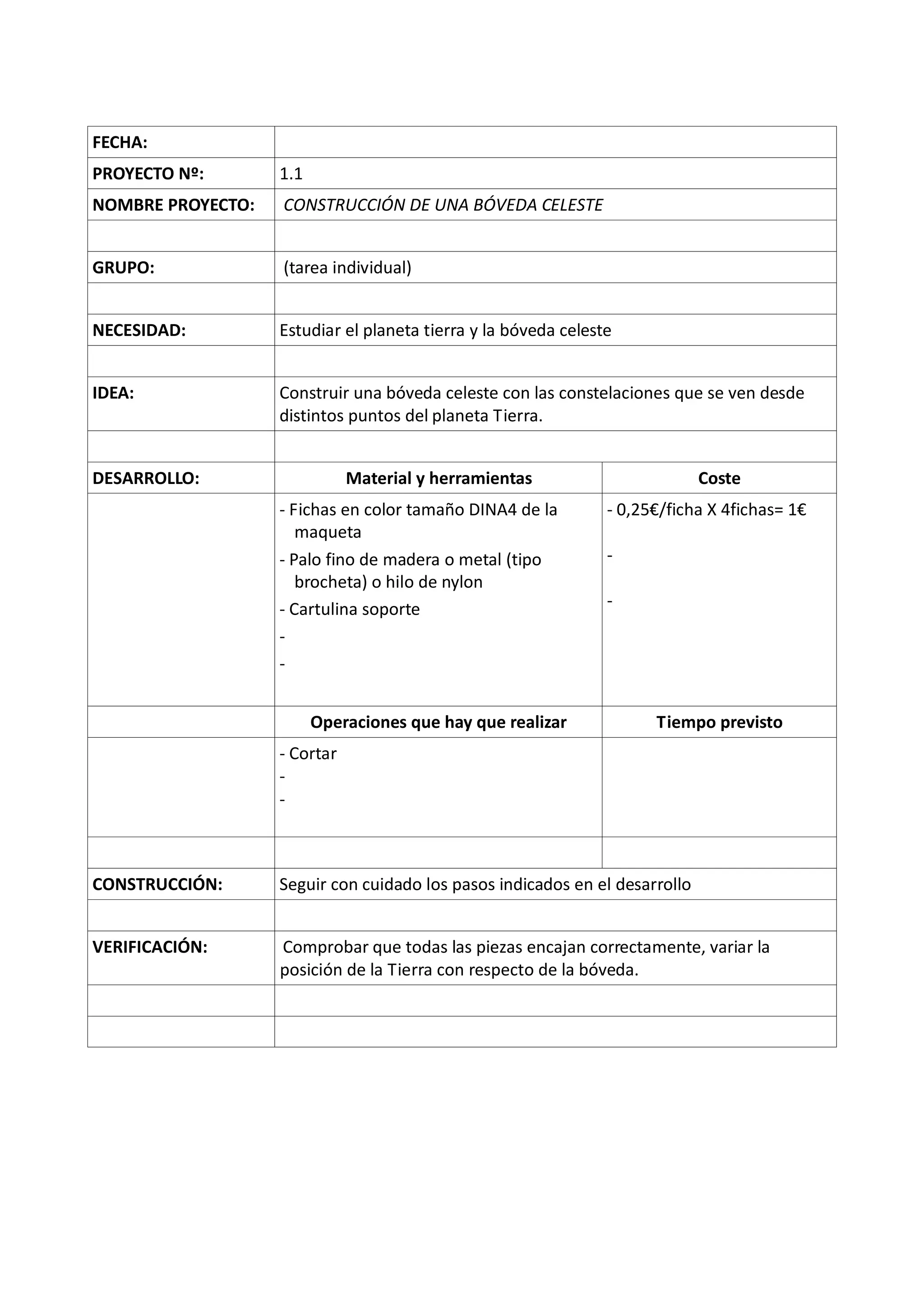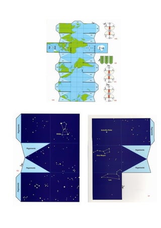 Este documento describe un proyecto para construir una maqueta de la bóveda celeste. El proyecto implica construir una representación de las constelaciones visibles desde diferentes puntos de la Tierra usando fichas de colores, palos y cartulina. El documento también describe los pasos y materiales necesarios para la construcción, así como las pruebas para verificar que las piezas encajan correctamente y que se puede variar la posición de la Tierra con respecto a la bóveda celeste.