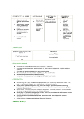 Este documento proporciona información sobre el amoníaco, incluidas sus propiedades físicas y químicas, concentraciones ambientales permisibles, riesgos para la salud, medidas de seguridad e higiene industrial, y equipos de protección personal. El amoníaco es un gas incoloro altamente irritante que puede causar quemaduras graves en los ojos, piel y vías respiratorias. La exposición aguda puede provocar edema pulmonar y broncoespasmo, mientras que la exposición prolongada puede causar irritación crónica