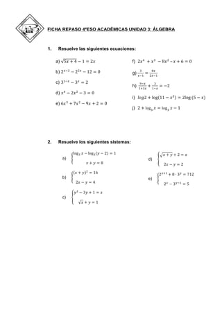 Este documento presenta varios ejercicios de álgebra para repasar contenidos de 4o de la ESO. Incluye resolver ecuaciones y sistemas de ecuaciones. Se piden resolver ecuaciones como 5x + 4 - 1 = 2x, 2x^2 - 2x - 12 = 0 y log2 + log11 - x = 2log(5 - x). También sistemas como log_2x - log_2(y - 2) = 1, x + y = 8 y x + y + 2 = x, 2x - y = 2.