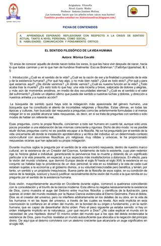 El documento trata sobre la búsqueda del sentido de la vida humana desde una perspectiva filosófica. Durante mucho tiempo, la religión cristiana proporcionó una respuesta al dar a la vida un propósito y significado vinculado a un plan divino. Sin embargo, con el avance de la ciencia moderna y corrientes filosóficas como el empirismo, la ilustración y el positivismo, esta visión comenzó a cuestionarse y a negarse, planteando una crisis sobre el sentido de la existencia. Actualmente, existen diferentes posturas al respect