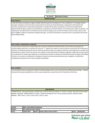 La Hacienda El Cedrón se encuentra ubicada en la vereda El Cedrón del municipio de Tarso, Antioquia. Data de la época de la colonización antioqueña y constituye un hito histórico importante en la región debido a su producción de caña y trapiches. La casa de la hacienda conserva parte de su estructura original de madera y es reconocida como la casa paterna del escritor Manuel Mejía Vallejo. Representa valor histórico, estético, arquitectónico y simbólico para