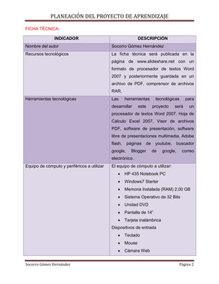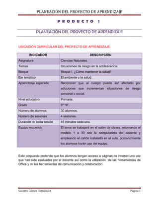 Este documento presenta la planeación de un proyecto de aprendizaje sobre situaciones de riesgo en la adolescencia para el grado 5° "B". El proyecto se llevará a cabo en 4 sesiones de 45 minutos cada una utilizando recursos tecnológicos como computadoras, proyectores y pizarrón interactivo. El proyecto busca que los alumnos reconozcan cómo el cuerpo puede ser afectado por adicciones que incrementan riesgos personales o sociales.