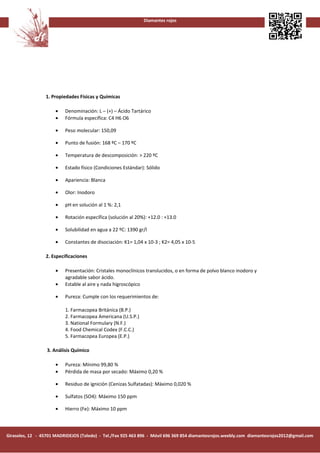 Este documento presenta las propiedades físicas y químicas del ácido tartárico, incluyendo su fórmula, peso molecular, punto de fusión, solubilidad en agua y especificaciones de pureza. Proporciona detalles sobre su presentación como cristales translúcidos o polvo blanco, y estabilidad al aire. Además, enumera los límites máximos permitidos para impurezas como sulfatos, hierro, plomo, mercurio y otros metales pesados según diferentes farmacopeas.