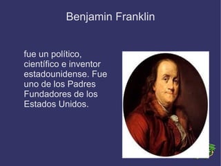 Benjamin Franklin fue un político, científico e inventor estadounidense y uno de los Padres Fundadores de los Estados Unidos. Estaba interesado en los fenómenos naturales y realizó experimentos peligrosos como elevar una cometa durante una tormenta para probar su teoría de que los rayos son manifestaciones de electricidad. Más tarde inventó el pararrayos para proteger los edificios de los daños causados por los rayos.