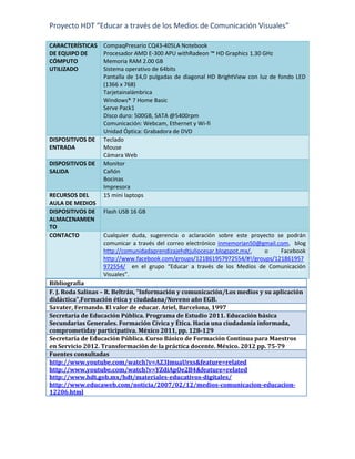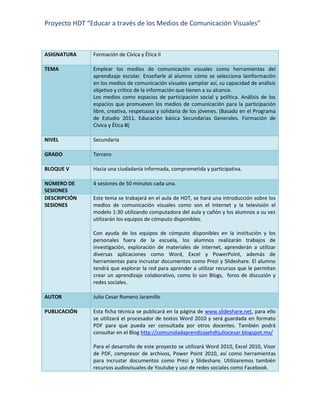 Este documento describe un proyecto para enseñar a estudiantes de secundaria a analizar y usar críticamente los medios de comunicación visuales como Internet y la televisión. El proyecto consiste en 4 sesiones donde los estudiantes investigarán en línea, aprenderán habilidades tecnológicas y cómo los medios promueven la participación social. El proyecto se llevará a cabo en el aula de medios de la escuela usando computadoras portátiles y otros recursos tecnológicos.