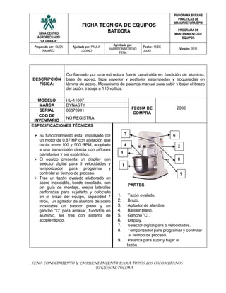 Este documento describe una batidora industrial con un motor de 0.87 HP que puede oscilar entre 100 y 500 RPM. Tiene un tazón de acero inoxidable de 7 litros y varios accesorios. Se usa para mezclar y amasar materiales de manera eficiente. Requiere limpieza y mantenimiento periódicos para funcionar de manera segura a 110 voltios.