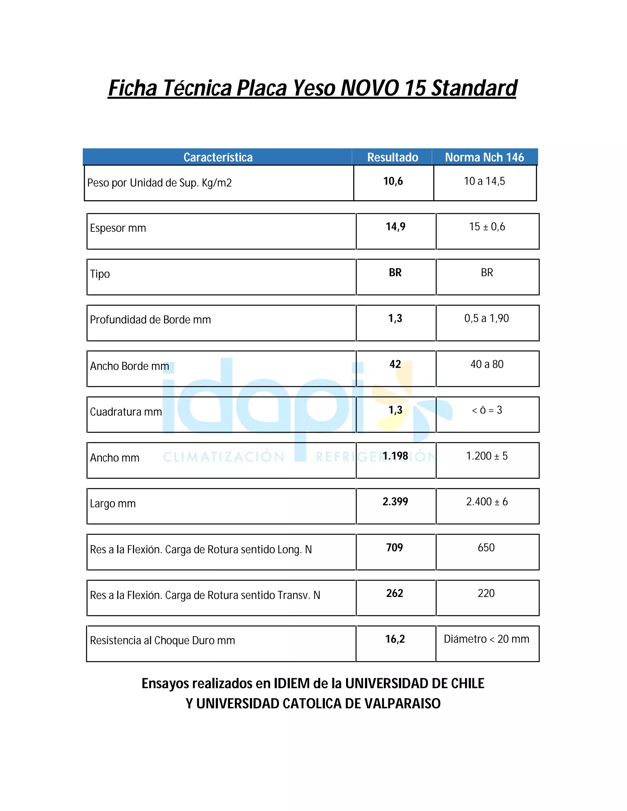 La placa de yeso NOVO 15 Standard cumple con las normas NCH 146 en cuanto a peso, espesor, tipo, profundidad y ancho de borde. Mide aproximadamente 1.2 m de ancho y 2.4 m de largo y tiene una alta resistencia a la flexión, tanto en el sentido longitudinal como transversal, así como una buena resistencia al choque duro.
