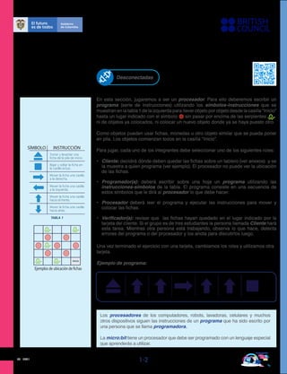 El documento habla sobre la introducción a la programación y los computadores. Explica que muchos artefactos como lavadoras y celulares tienen procesadores que ejecutan programas. Luego muestra cómo programar una micro:bit para hacer parpadear un corazón y explica conceptos básicos como variables booleanas, entradas y salidas.