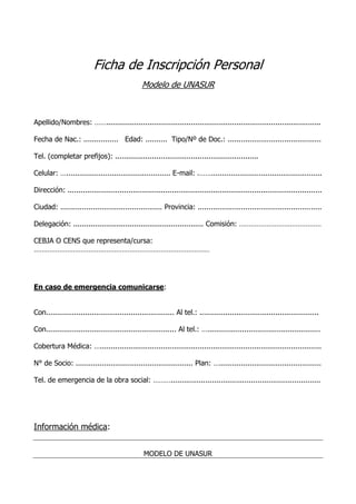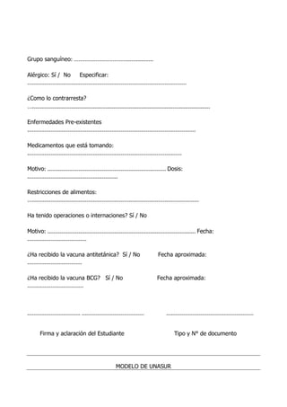Este documento es un formulario de inscripción personal para el modelo de UNASUR. Contiene secciones para los datos personales como nombre, fecha de nacimiento, edad, documento de identidad, teléfonos, dirección, cobertura médica y emergencia. También incluye una sección de información médica con detalles sobre el grupo sanguíneo, alergias, enfermedades preexistentes, medicamentos, restricciones alimenticias y vacunas recibidas. El estudiante debe firmar el formulario al final.