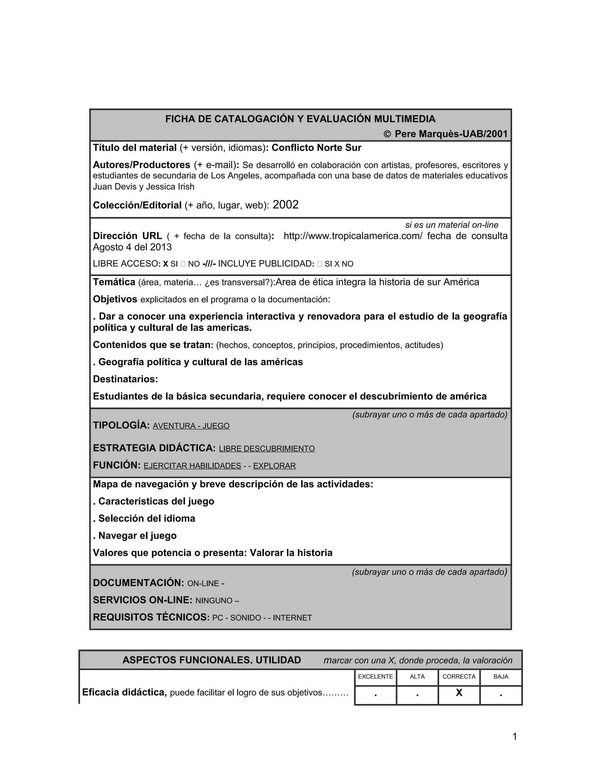Este documento evalúa un material multimedia llamado "Conflicto Norte Sur" que aborda la geografía política y cultural de las Américas. El material es interactivo y busca dar a conocer la historia de Suramérica a través de un juego de aventura. Se destaca que el material tiene potencial didáctico aunque presenta algunas limitaciones técnicas y falta de servicios en línea.