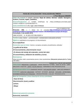 Este documento resume una ficha de evaluación de un juego online llamado "Sopa de Letras" dirigido a estudiantes de primaria de 6-7 años. El juego practica habilidades de lectura y escritura a través de rompecabezas léxicos en varios idiomas. La evaluación encuentra que el juego es útil para su propósito pero que contiene demasiada publicidad. Carece de una guía didáctica pero es fácil de usar y motiva a los estudiantes.
