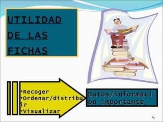 El documento proporciona información sobre la utilidad y tipos de fichas para la investigación. Explica que las fichas se usan para recopilar y organizar información de manera sistemática. Describe dos tipos principales de fichas: fichas de referencia (bibliográficas y hemerográficas) y fichas de contenido (textuales, de resumen, sintéticas). Además, incluye ejemplos de cómo elaborar diferentes tipos de fichas bibliográficas según la fuente y proporciona un esquema básico para