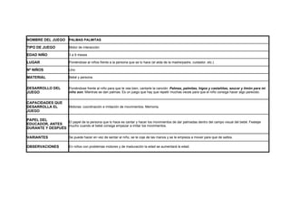 Estos documentos proporcionan información sobre 10 juegos motores tradicionales para niños pequeños. Cada juego describe su nombre, tipo, edad recomendada, materiales necesarios y cómo se desarrolla, enfocándose en desarrollar habilidades motoras, de interacción social y cognitivas en los niños. Los juegos involucran cantos, movimientos y cosquillas para motivar a los niños a imitar acciones.