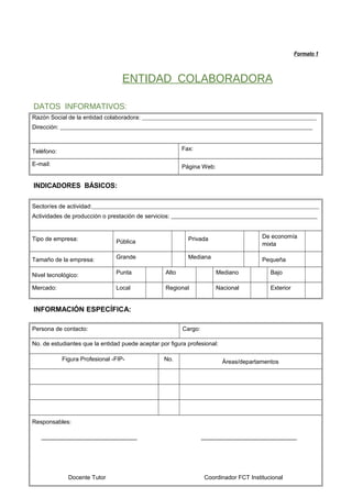 Este documento contiene 7 formatos diferentes relacionados con la formación en centros de trabajo. Los formatos incluyen información sobre la entidad colaboradora, programas formativos generales y específicos, registro de asistencia del estudiante, evaluación individual, registro semanal de actividades y hoja de ruta.