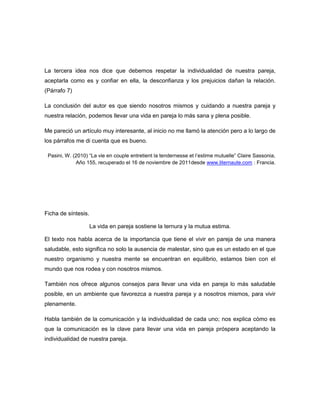 El documento habla sobre la importancia de vivir en pareja de manera saludable, lo que significa tener equilibrio mental y físico. También ofrece consejos como la comunicación efectiva y el respeto de la individualidad para tener una relación próspera. Lo más importante es aceptarse uno mismo, respetar a la pareja y amarla para que la relación sea sana y permita crecimiento personal.