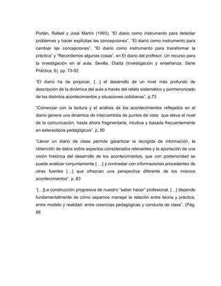 El documento destaca la importancia del diario de trabajo como herramienta para que los docentes realicen un análisis reflexivo detallado de los sucesos diarios en el aula, lo que les brinda una perspectiva amplia de su labor. Además, el diario contribuye a la reflexión personal y al diálogo con otros, enfocando la intervención hacia la mejora. Igualmente, permite organizar la información y establecer un panorama entre lo planificado, ejecutado y los resultados, pudiendo complementarse con otros medios como videos o audios. El