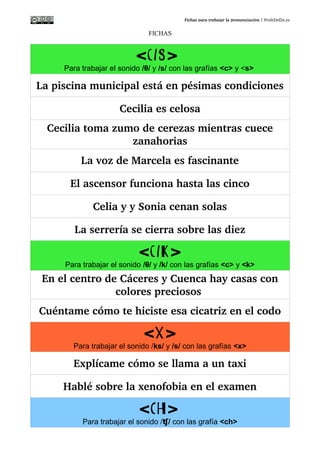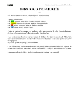 El documento presenta fichas diseñadas para trabajar la pronunciación en español, utilizando un enfoque color-coded para distinguir entre diferentes sonidos y grafías. Incluye indicaciones sobre la adaptación del material a diversas variantes del español y se basa en el alfabeto fonético internacional. Además, proporciona ejemplos de frases para practicar diferentes fonemas y grafías del idioma.