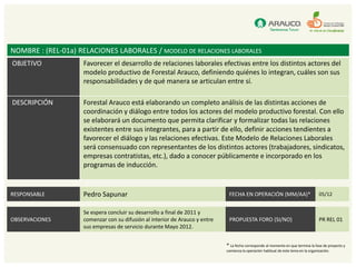 Este documento describe varios proyectos relacionados con las relaciones laborales entre Forestal Arauco y sus empresas contratistas. Los proyectos buscan favorecer el diálogo y la coordinación entre los actores, promover la capacitación de trabajadores, y establecer estándares mínimos de gestión para las empresas contratistas. En total se describen 14 proyectos individuales con objetivos, descripciones y responsables específicos.