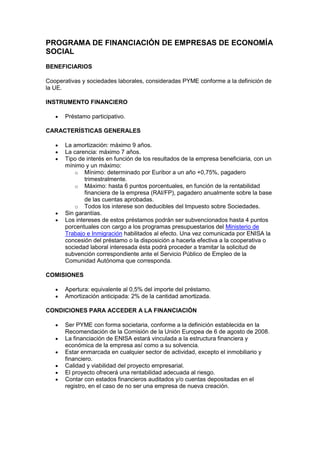 Este documento presenta varios programas de financiación de ENISA dirigidos a PYME en diferentes sectores. Los programas ofrecen préstamos participativos con características similares como vencimientos de hasta 9 años, carencias de hasta 7 años e intereses variables en función de los resultados de la empresa. Los programas están destinados a PYME del sector aeronáutico, economía social, emprendedoras, continuidad empresarial, jóvenes emprendedores, innovación y cofinanciación con business angels.