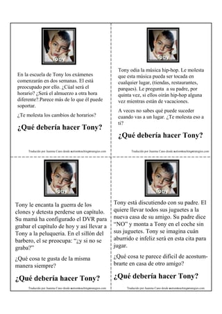 Este documento describe varias situaciones en las que niños experimentan preocupaciones comunes como el miedo al cambio, a lo desconocido, a ser juzgados o a ciertas sensaciones. Cada historia presenta una preocupación de un niño y sugiere posibles formas en que podría manejarla.