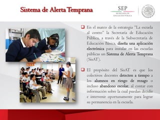 El documento describe el Sistema de Alerta Temprana (SisAT) implementado por la Secretaría de Educación Pública en las escuelas públicas. El SisAT tiene como objetivo detectar de manera oportuna a los estudiantes en riesgo de retraso o abandono escolar mediante el monitoreo sistemático de su desempeño académico y asistencia. Los docentes y directivos ingresan datos a la aplicación electrónica para generar informes que permitan intervenir tempranamente con los estudiantes que lo requieran y así evitar