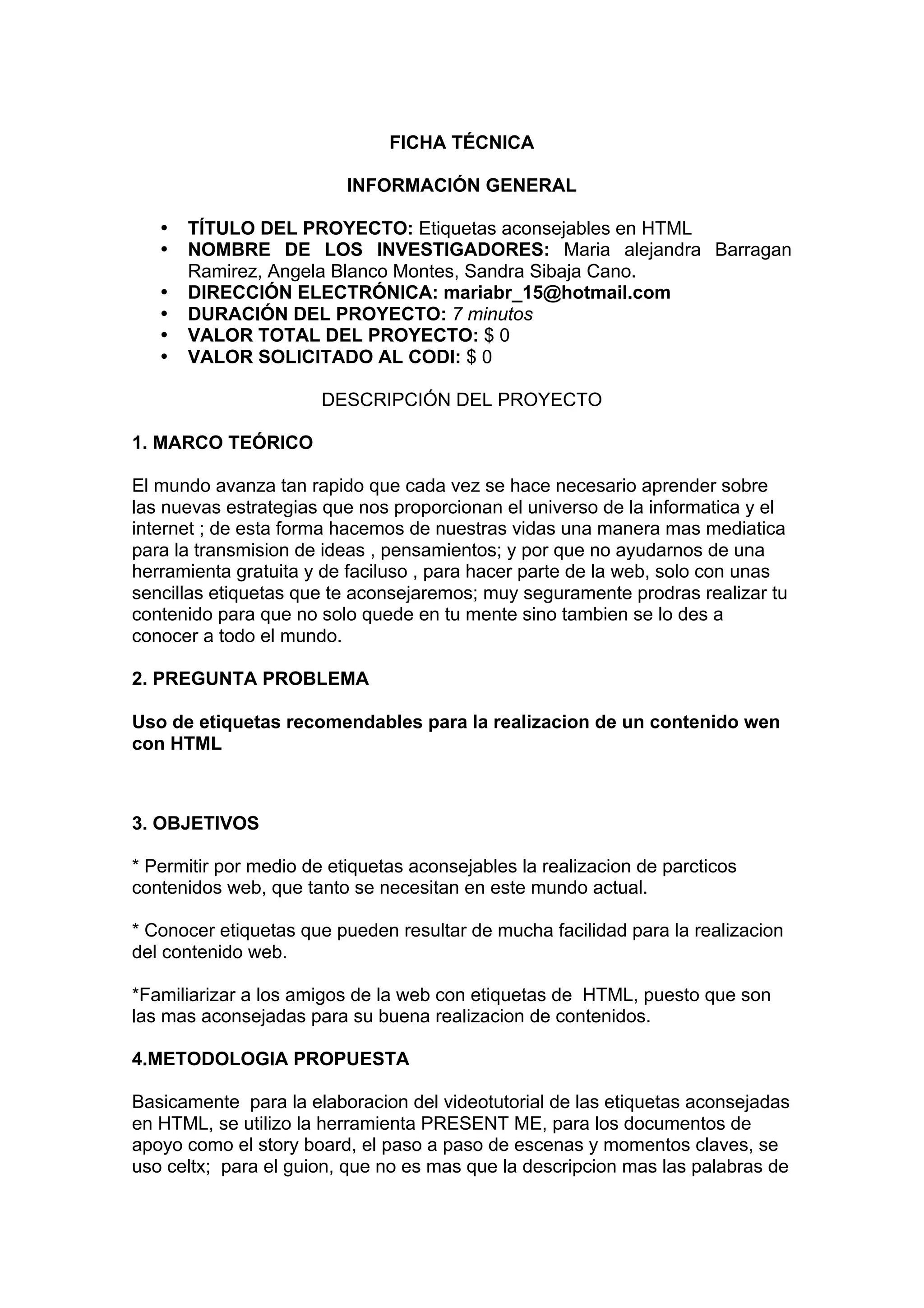 Este documento presenta la ficha técnica de un proyecto que crea un video tutorial de 7 minutos sobre etiquetas recomendables en HTML. El proyecto fue realizado por 3 investigadores y no requirió fondos. El video tutorial explica etiquetas HTML para permitir la creación de contenido web de manera fácil utilizando herramientas como Present Me y PowerPoint. El objetivo es ayudar a otros a hacer contenido web accesible a todo el mundo.