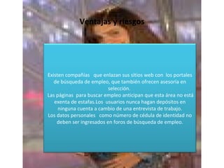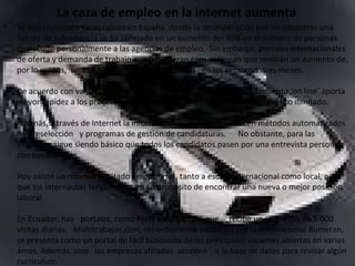 El documento habla sobre el aumento en la búsqueda de empleo a través de Internet. Reporta un aumento del 30% en personas que acuden a agencias de empleo en España debido a la desesperación por encontrar trabajo. Los portales de empleo internacionales anticipan un aumento del 25% en currículums ingresados en los próximos tres meses. El reclutamiento en línea aporta mayor rapidez y alcance geográfico ilimitado. Sin embargo, las entrevistas personales siguen siendo fundamentales para las empresas. Existen opciones