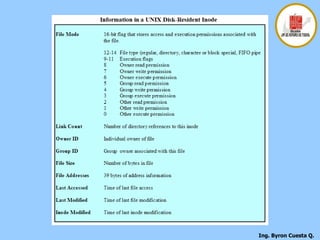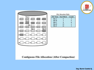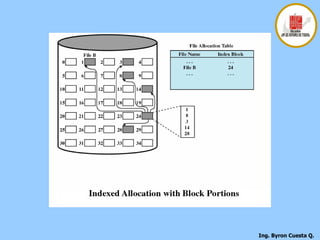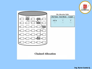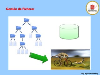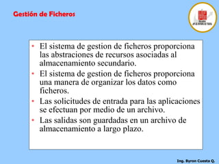 El documento describe los conceptos fundamentales de los sistemas de gestión de archivos, incluyendo la organización lógica de los archivos y registros, las funciones básicas de gestión de archivos, y los objetivos de los sistemas de gestión de archivos como proporcionar acceso a los datos de forma fiable y optimizar el rendimiento.