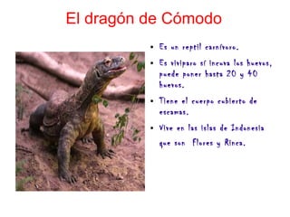 Este documento contiene descripciones breves de varios animales vertebrados. Cada descripción incluye detalles clave sobre las características físicas, hábitat, dieta y comportamiento reproductivo del animal. Los animales descritos incluyen el dragón de Komodo, oso panda, caballo, lince ibérico, perro, guepardo, tiburón, lobo blanco, gato, águila, caimán, lobo, tigre, garduña, león, guacamayo, oso pardo y o