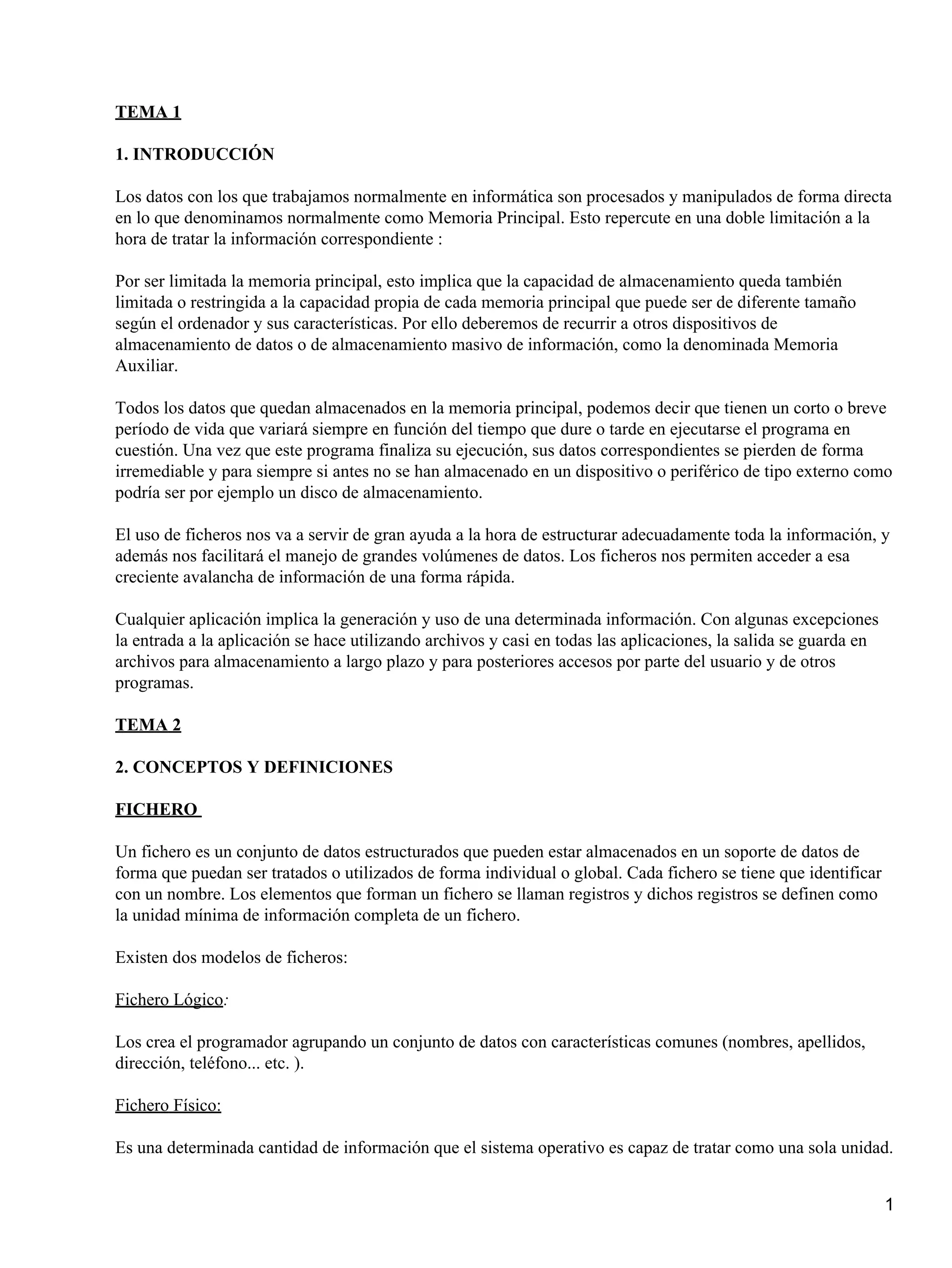 El documento describe los conceptos básicos de los ficheros y la estructura de registros. Explica que los ficheros permiten almacenar grandes volúmenes de datos de forma estructurada y facilitan el acceso a la información. Los registros son las unidades mínimas de información dentro de un fichero y pueden tener longitud fija o variable. Los campos son los elementos que componen cada registro.