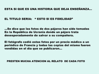 El documento presenta la historia de dos pájaros donde uno cuida y trata desesperadamente de salvar a su compañera que está gravemente herida. Cuando regresa, se da cuenta que ella ha muerto y trata de moverla y hacerla reaccionar gritando su desolación al no poder revivirla. La enseñanza es que el amor verdadero es cuando no se puede dejar de vivir con alguien.