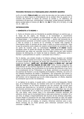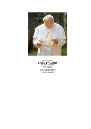 Este documento es la carta encíclica Fides et Ratio del Papa Juan Pablo II dirigida a los obispos de la Iglesia Católica sobre las relaciones entre fe y razón. El Papa argumenta que la fe y la razón son como dos alas que permiten al espíritu humano elevarse hacia la contemplación de la verdad. Además, señala que la filosofía ha ayudado a la humanidad a comprenderse mejor y progresar, pero que recientemente ha habido una falta de confianza en la capacidad de la razón para alcan