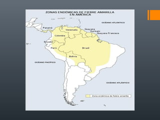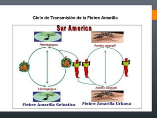 La fiebre amarilla es causada por un virus transmitido por mosquitos en zonas tropicales de África y América del Sur. Los síntomas incluyen fiebre, dolor de cabeza, ictericia y en casos graves, insuficiencia hepática, hemorragia y muerte. No tiene tratamiento específico, pero la vacunación ofrece protección por 10 años contra la enfermedad en áreas de riesgo como la selva alta del Perú.