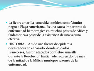 La fiebre amarilla es una enfermedad hemorrágica causada por el virus de la fiebre amarilla, que se transmite a través de la picadura de mosquitos en áreas tropicales y subtropicales de América y África. Históricamente ha causado devastadoras epidemias y sigue siendo una causa importante de enfermedad en países sin vacunación efectiva. Los síntomas incluyen fiebre, dolor de cabeza, náuseas y, en algunos casos, ictericia, insuficiencia renal y muerte. La mejor