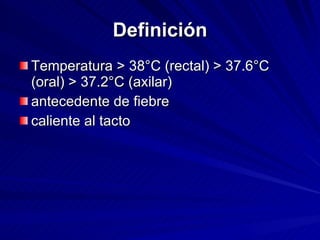 La fiebre se define como una temperatura mayor a 38°C rectal o 37.6°C oral. Puede ser causada por infecciones virales, bacterianas o parasitarias. En niños menores de 6 meses es más común una etiología bacteriana. El documento describe los síntomas, el diagnóstico a través del examen físico y exámenes de laboratorio, y el tratamiento con antipiréticos y medidas de apoyo. También discute el protocolo de Filadelfia para el manejo ambulatorio de fiebre en niños menores de 2