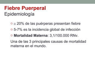 Este documento describe varias causas de fiebre en el puerperio, incluyendo endometritis, infección urinaria, mastitis y tromboflebitis pélvica. Explica los factores de riesgo, síntomas, diagnóstico y tratamiento de cada una. Resalta que la endometritis es la infección post-parto más frecuente y que el parto por cesárea aumenta significativamente el riesgo. Proporciona recomendaciones para prevenir infecciones quirúrgicas tales como la técnica qu