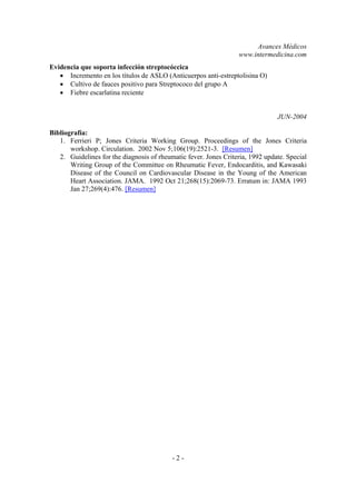 Este documento describe los criterios de Jones para el diagnóstico de la fiebre reumática. La fiebre reumática es más común en niños de bajos recursos y afecta principalmente el corazón, dañando comúnmente la válvula mitral. El diagnóstico se basa en la presencia de criterios mayores como la carditis o poliartritis, o un criterio mayor y dos menores como la fiebre o artralgia, siempre que exista evidencia de infección por estreptococo.