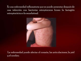 La fiebre reumática es una enfermedad inflamatoria que ocurre después de una infección estreptocócica y puede afectar el corazón, las articulaciones y la piel. Se presenta principalmente en niños entre 6 y 15 años y causa daño a las válvulas cardíacas. El diagnóstico requiere evidencia de una infección estreptocócica previa y la presencia de dos criterios principales o uno principal y dos secundarios. El tratamiento incluye antibióticos y antiinflamatorios para prevenir recurren